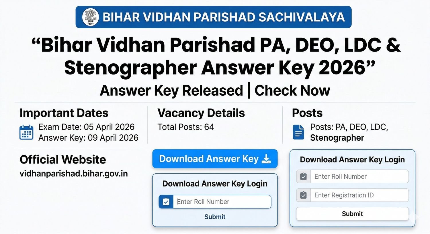 Q. When was the Bihar Vidhan Parishad PA, DEO, LDC & Stenographer Answer Key 2026 officially announced? Answer. The Bihar Vidhan Parishad PA, DEO, LDC & Stenographer Answer Key 2026 has issued on 09 April 2026 by BVP.